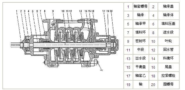 GC型水泵的主要零件有軸、軸套、進水段、葉輪、導翼、密封環、中段、出水段、平衡環、平衡盤、尾蓋。